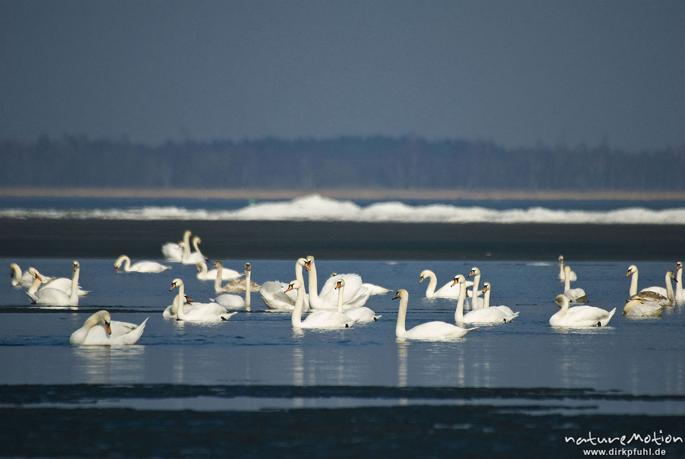 Höckerschwan, Cygnus olor, Anatidae, großer Trupp schwimmend in seichter Bucht, Ufer mit Eisschollen, Barther Bodden, A nature document - not arranged nor manipulated, Nisdorf, Deutschland