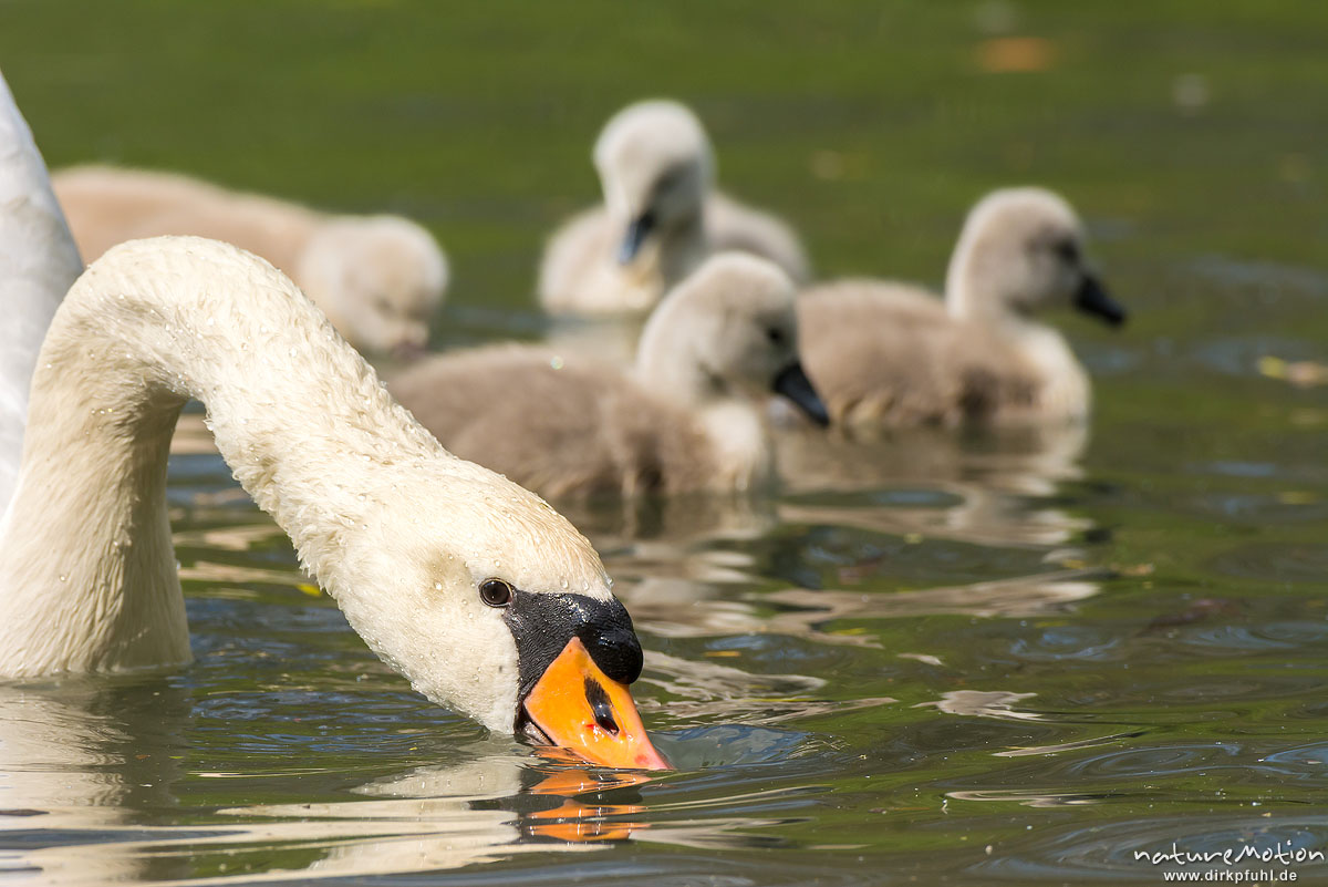 Höckerschwan, Cygnus olor, Entenvögel (Anatidae), Alttier mit Küken, Levinscher Park, Göttingen, Deutschland