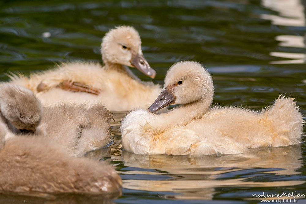 Höckerschwan, Cygnus olor, Entenvögel (Anatidae), Küken, Bad und Gefiederpflege, Levinscher Park, Göttingen, Deutschland