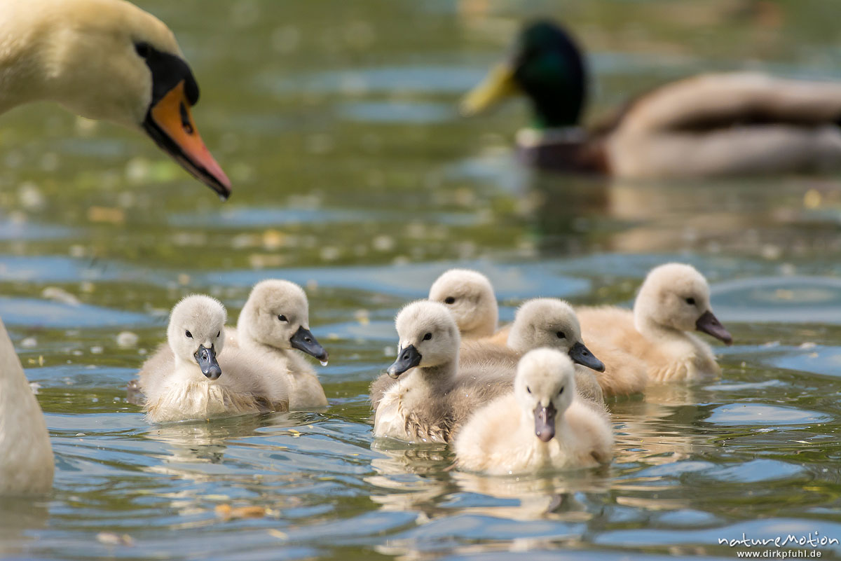 Höckerschwan, Cygnus olor, Entenvögel (Anatidae), Küken mit Alttieren, Levinscher Park, Göttingen, Deutschland