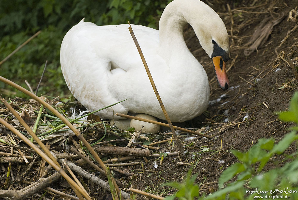 Höckerschwan, Cygnus olor, Entenvögel (Anatidae), Weibchen beim brüten auf Nest, umlagern der Eier, Werra, A nature document - not arranged nor manipulated Hinweis: Dieses Nest befand sich in 2 m (!) Entfernung von einer befestigten Einsatzstelle für Wasserwanderer. Das Schwanenpaar ließ sich nicht von den in direkter Nähe befindlichen Menschen stören, den Fotografen eingeschlossen., Probstei Zella, Deutschland
