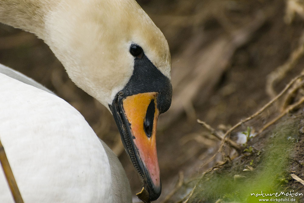 Hinweis: Dieses Nest befand sich in 2 m (!) Entfernung von einer befestigten Einsatzstelle für Wasserwanderer. Das Schwanenpaar ließ sich nicht von den in direkter Nähe befindlichen Menschen stören, den Fotografen eingeschlossen., Probstei Zella, Deutschland