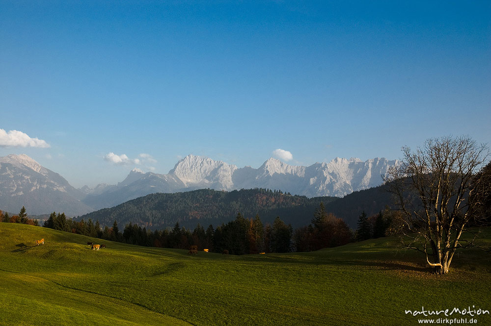 Höhenzüge des Karwendel im Abendlicht, Kühe auf der Weide, Blick von der Gschwandt-Alm, Garmisch-Partenkirchen, Deutschland