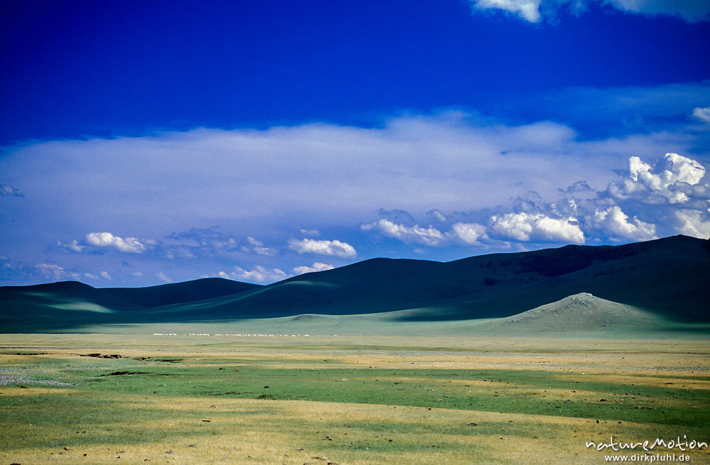 H?henzug mit Wolkenschatten, davor ein Ail aus vielen wei?en Jurten Changai, Mongolei