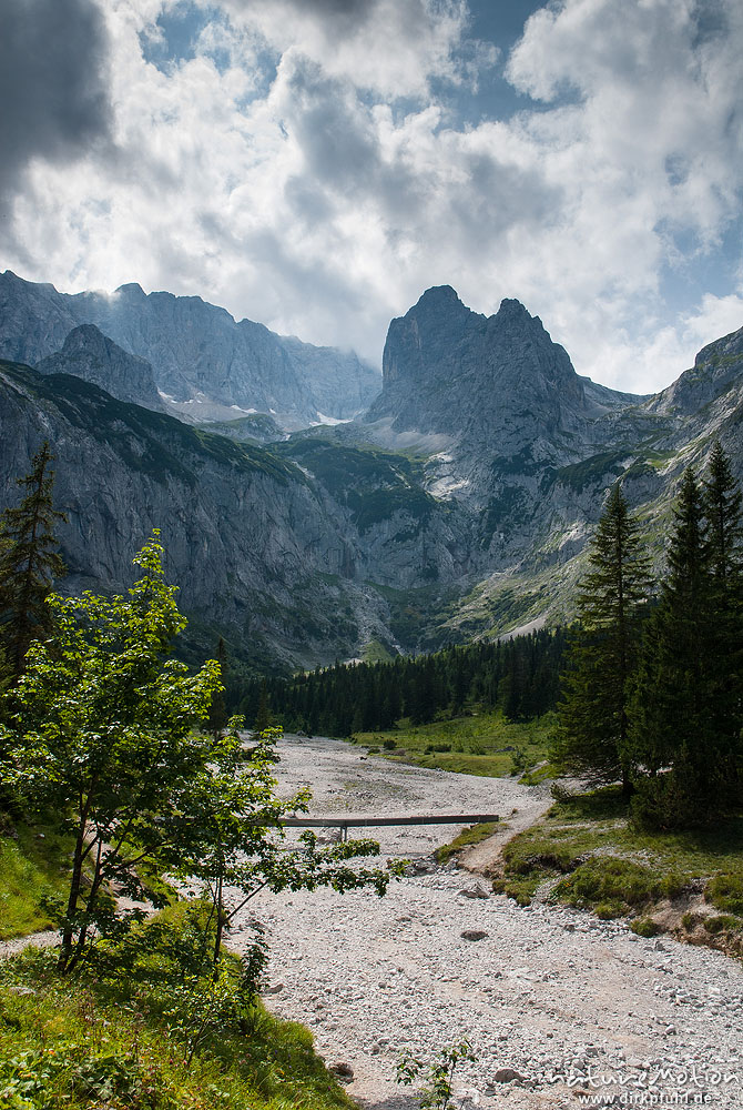 Höllentalanger mit Riffelspitzen, gerölliges Bachbett, Höllentalangerhütte, Wetterstein, Garmisch-Partenkirchen, Deutschland