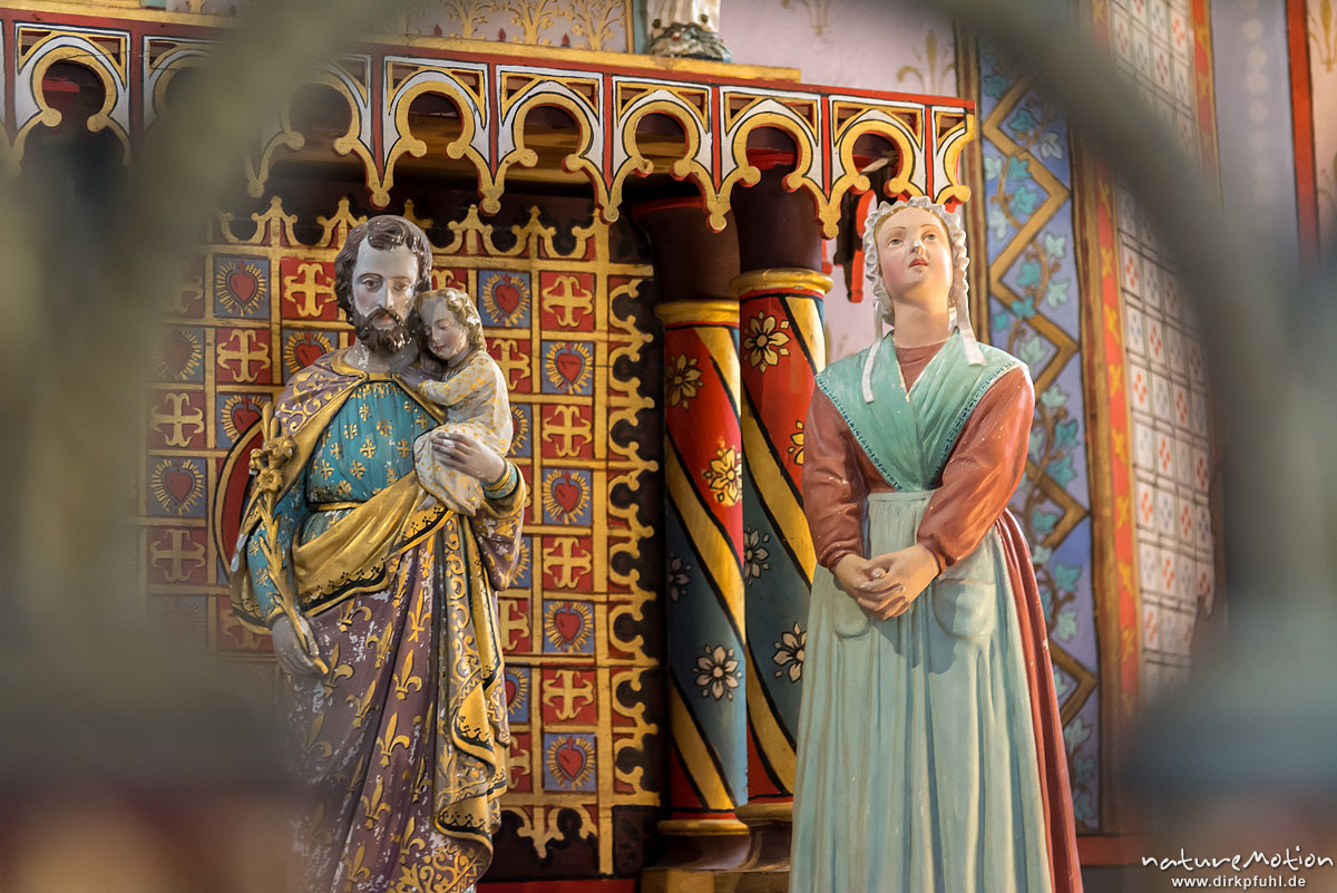 hölzerne Statuen von Joseph und Maria, Chapelle Saint Saturnin, Bédouès, Innenraum mit farbigen Wandmalereien, Florac, Frankreich