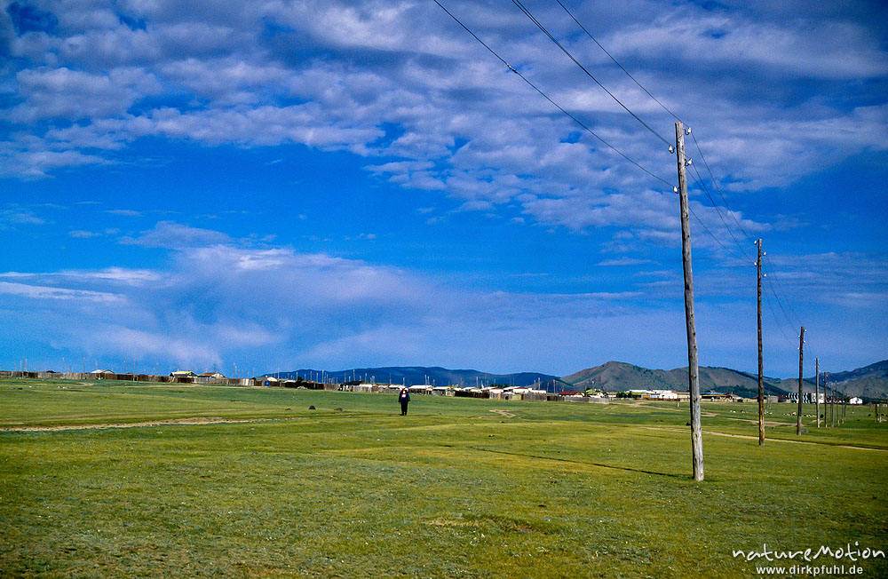 h?lzerne Strommasten f?hren zu einer Jurtensiedlung Changai, Mongolei