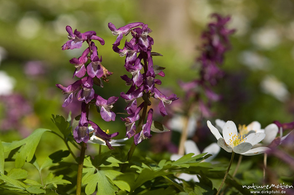 Hohler Lerchensporn, Corydalis cava, Fumariaceae, Buschwindröschen, Anemone nemorosa, Ranunculaceae, Frühjahrsgeophyten am Waldboden, Buchenwald, Fokusreihe, Settmarshausen bei Göttingen, Deutschland