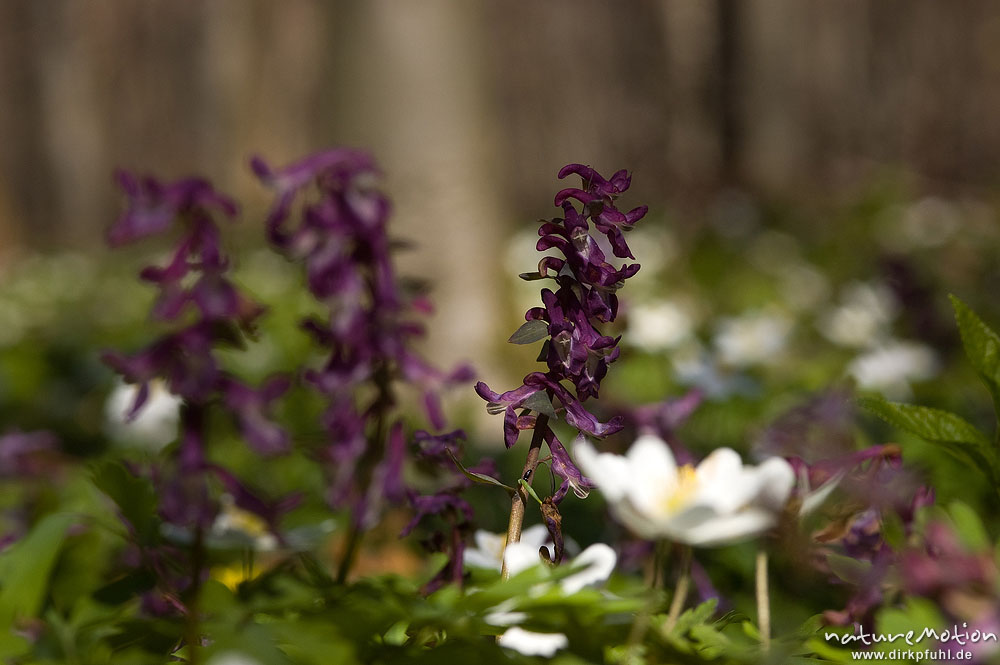 Hohler Lerchensporn, Corydalis cava, Fumariaceae, Buschwindröschen, Anemone nemorosa, Ranunculaceae, Frühjahrsgeophyten am Waldboden, Buchenwald, Fokusreihe, Settmarshausen bei Göttingen, Deutschland