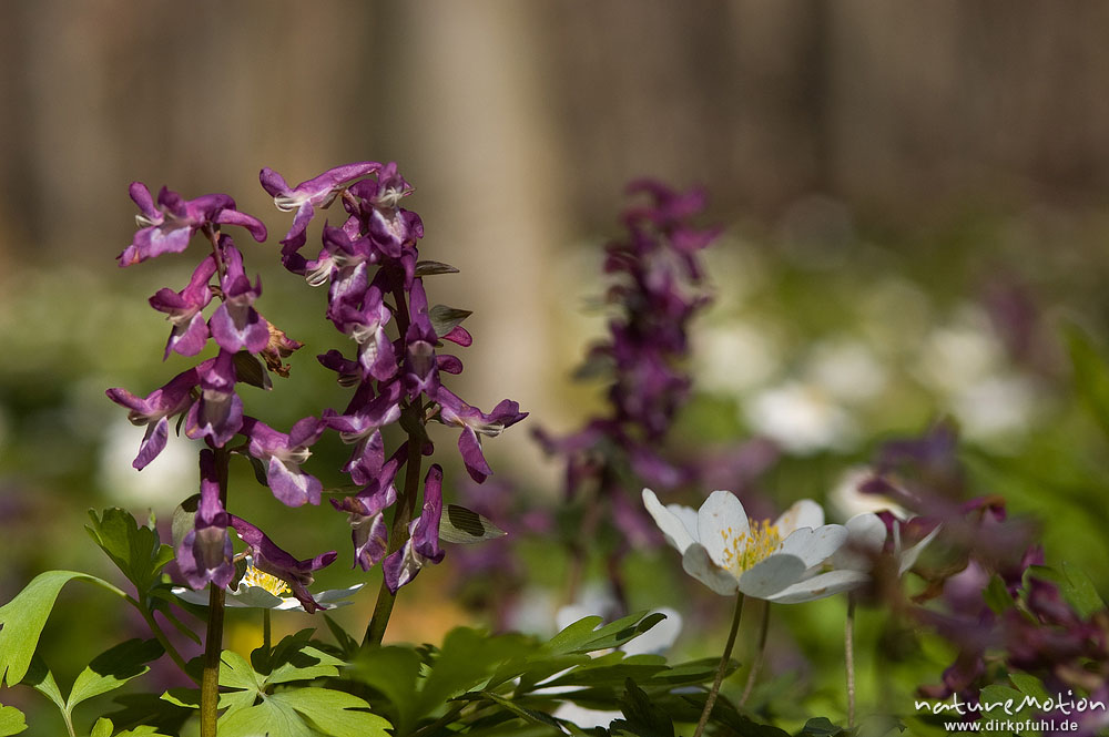 Hohler Lerchensporn, Corydalis cava, Fumariaceae, Buschwindröschen, Anemone nemorosa, Ranunculaceae, Frühjahrsgeophyten am Waldboden, Buchenwald, Fokusreihe, Settmarshausen bei Göttingen, Deutschland