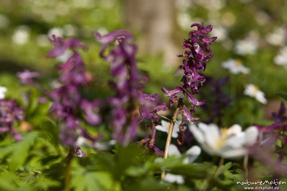 Hohler Lerchensporn, Corydalis cava, Fumariaceae, Buschwindröschen, Anemone nemorosa, Ranunculaceae, Frühjahrsgeophyten am Waldboden, Buchenwald, Fokusreihe, Settmarshausen bei Göttingen, Deutschland