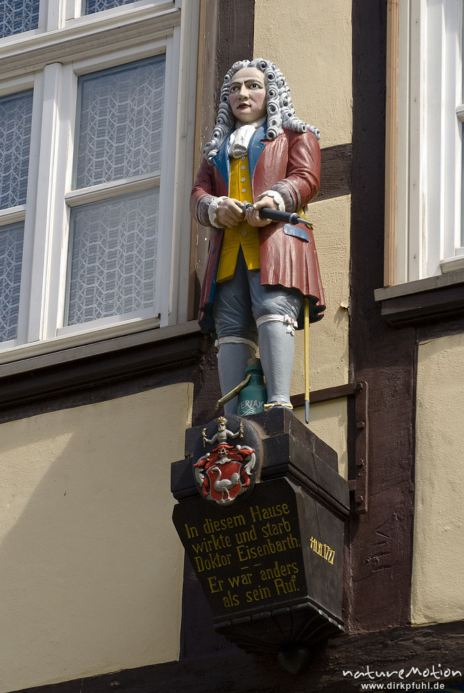 Holzfigur des Doktor Eisenbarth an der Fassade eines Fachwerkhauses, Hann. Münden, Deutschland