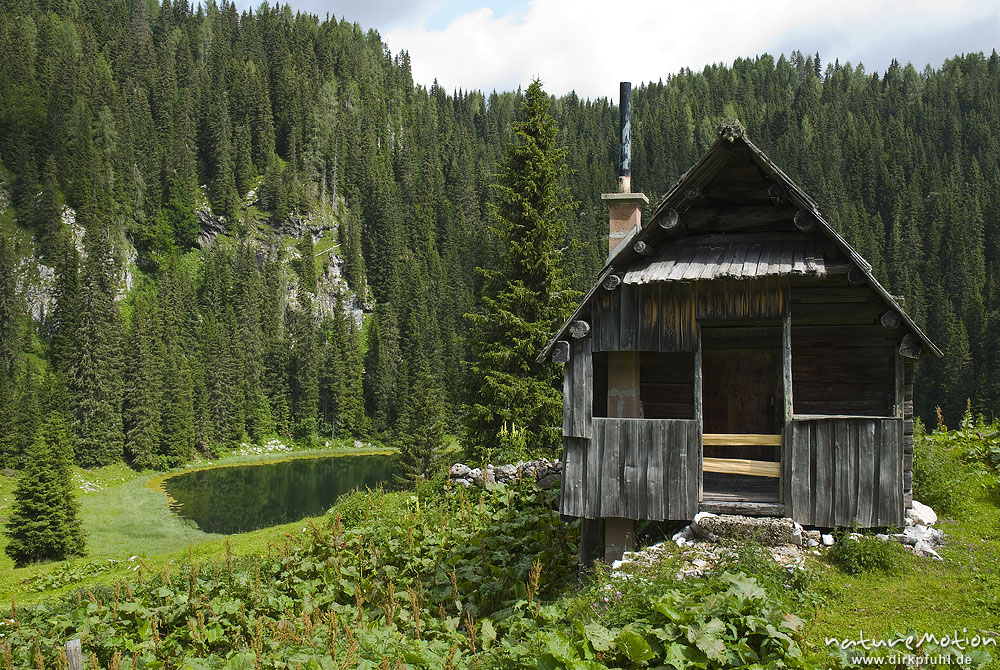 Holzhütten auf Alm, Planina Pri Jezeru, Triglav-Nationalpark, Slowenien