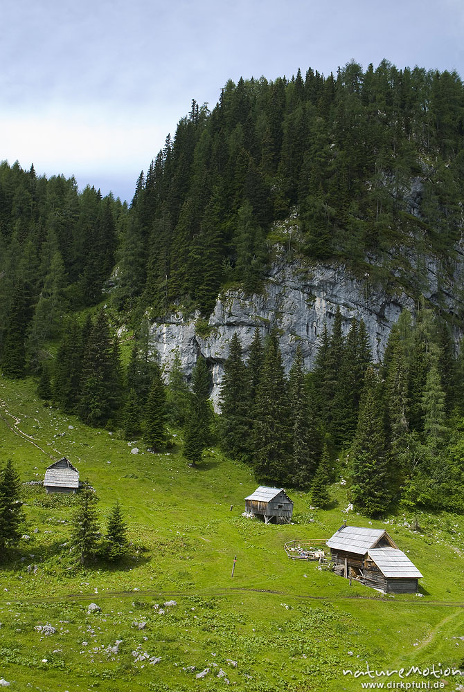 Holzhütten auf Alm, Planina Pri Jezeru, Triglav-Nationalpark, Slowenien