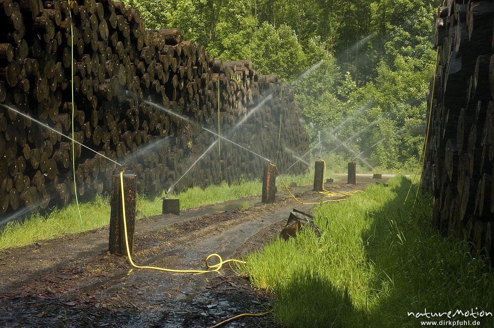 Holzlagerplatz mit Befeuchtung, Wassersprenger, Werratal, Hann. Münden, Deutschland