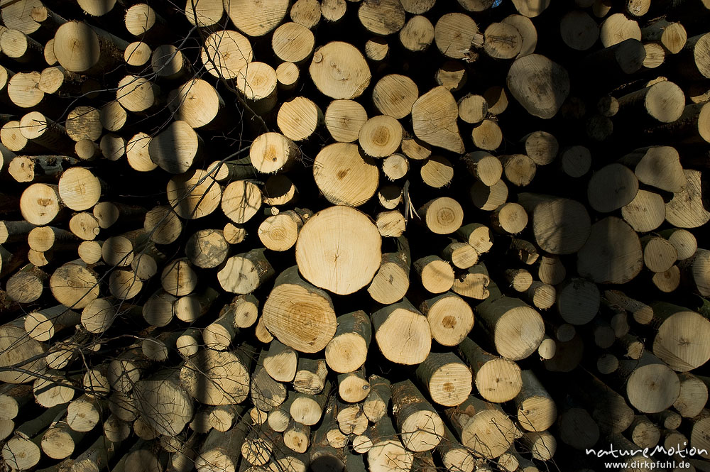 Holzstoß, frisch geschlagene Buchenstämme, Settmarshausen bei Göttingen, Deutschland
