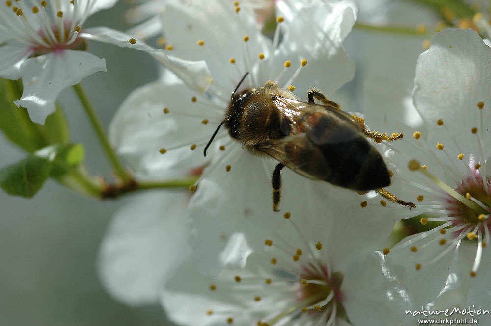 Honigbiene, Apis mellifera, auf Kirschblüte, Witzenhausen, Deutschland