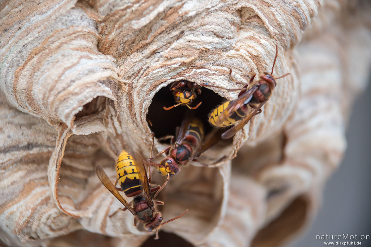 Hornisse, Vespa crabro, Faltenwespen (Vespidae), Hornissennest mit ein- und ausfliegenden Tieren, Campingplatz Parsteiner See, Parstein, Deutschland