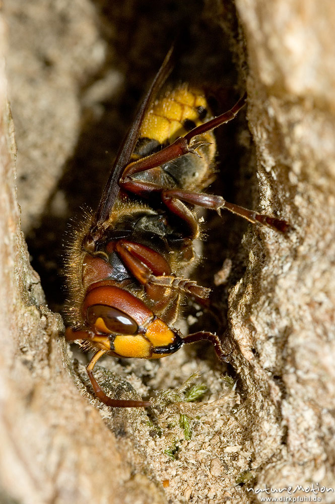 Hornisse, Vespa crabro, Vespidae, einzelnes Tier in Spalte in der Borke eines Kirschbaumes Witzenhausen, Deutschland