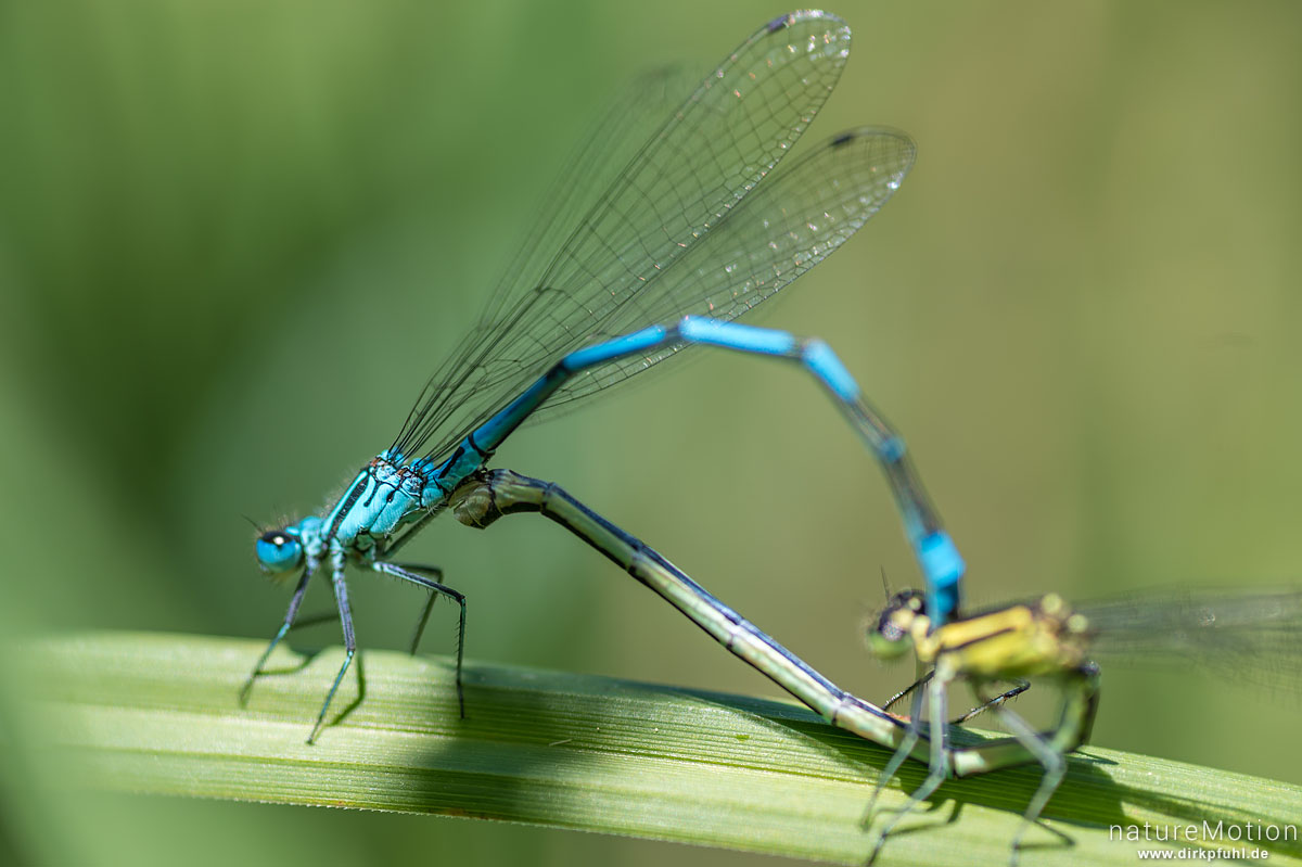 Hufeisen-Azurjungfer, Coenagrion puella, Coenagrionidae, Paarungsrad, Tümpel in einer extensiven Ganzjahresweide, Argensee, Gebrazhofen, Deutschland