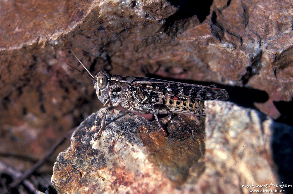 Italienische Schönschrecke, Calliptamus italicus, Acrididae, Felsen an der Küste von Galeria Korsika, Frankreich