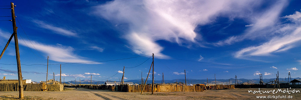 Jurtensiedlung mit Holzz?unen und Stromleitungen, Abendlicht Chowd, Mongolei