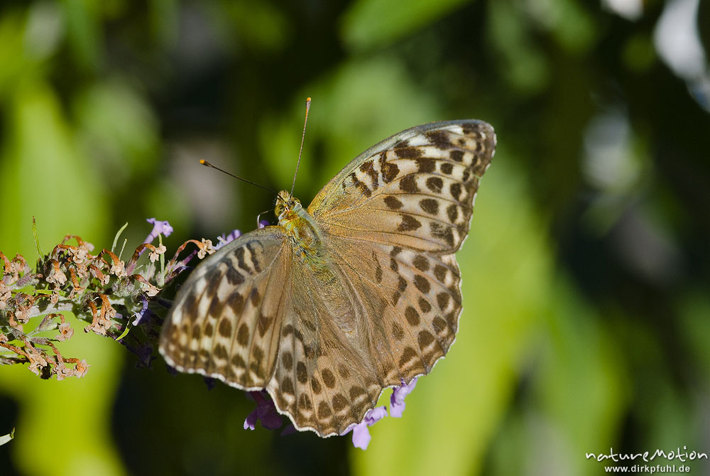 Kaisermantel, Argynnis paphia f. valesina, Nymphalidae, Weibchen, in grauer Form, auf Fliederblüten, Göttingen, Deutschland