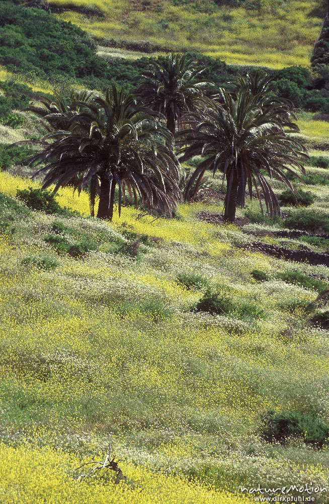 Kanarische Dattelpalme, Phoenix canariensis, Terrassen mit Blüten und Palmen, Valhermoso, Gomera, Spanien