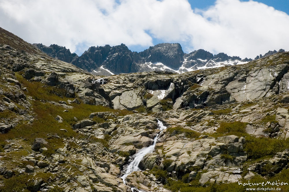 Kaskaden des Timozzo-Baches direkt unterhalb des Lac de l'Oriente, dahinter Gipfel des Monte Rotondo, Wolkenzug (siehe auch folgende Bilder), Korsika, Frankreich