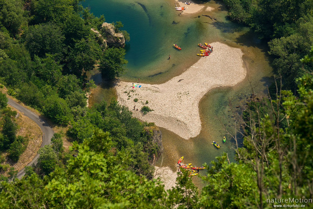 Kayaks auf dem Tarn, Blick vom Roc de Serne, La Malene, Frankreich