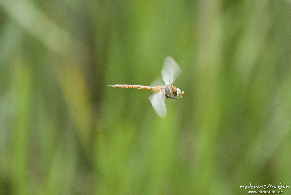 Keilfleck-Mosaikjungfer, Keilflecklibelle, Aeshna isoceles, Edellibellen (Aeshnidae), im Flug, Uferzone mit Schilf, Priesterbäker See, A nature document - not arranged nor manipulated, Speck, Deutschland