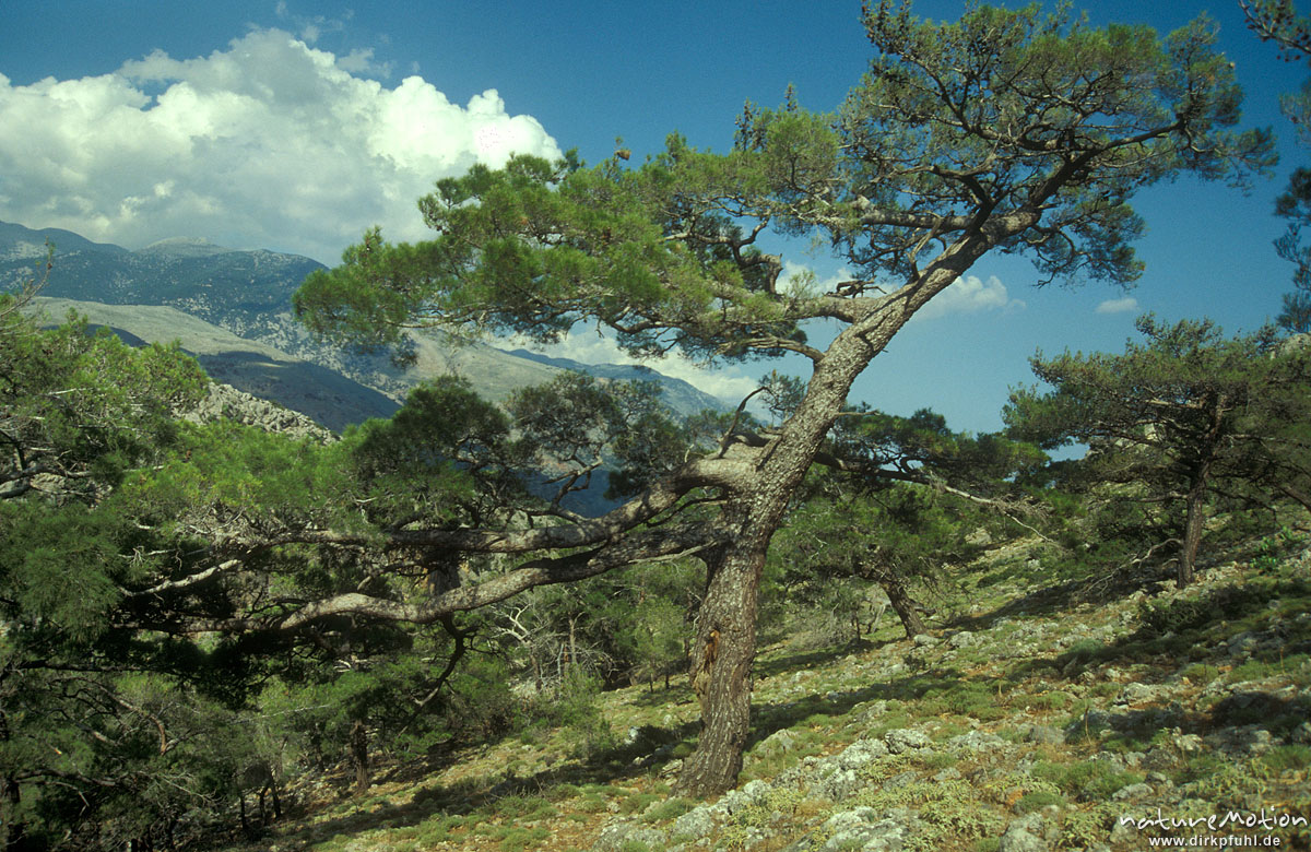 Kiefer am Hang, Hintergrund Berge und Himmel, Sougia, Kreta, Griechenland