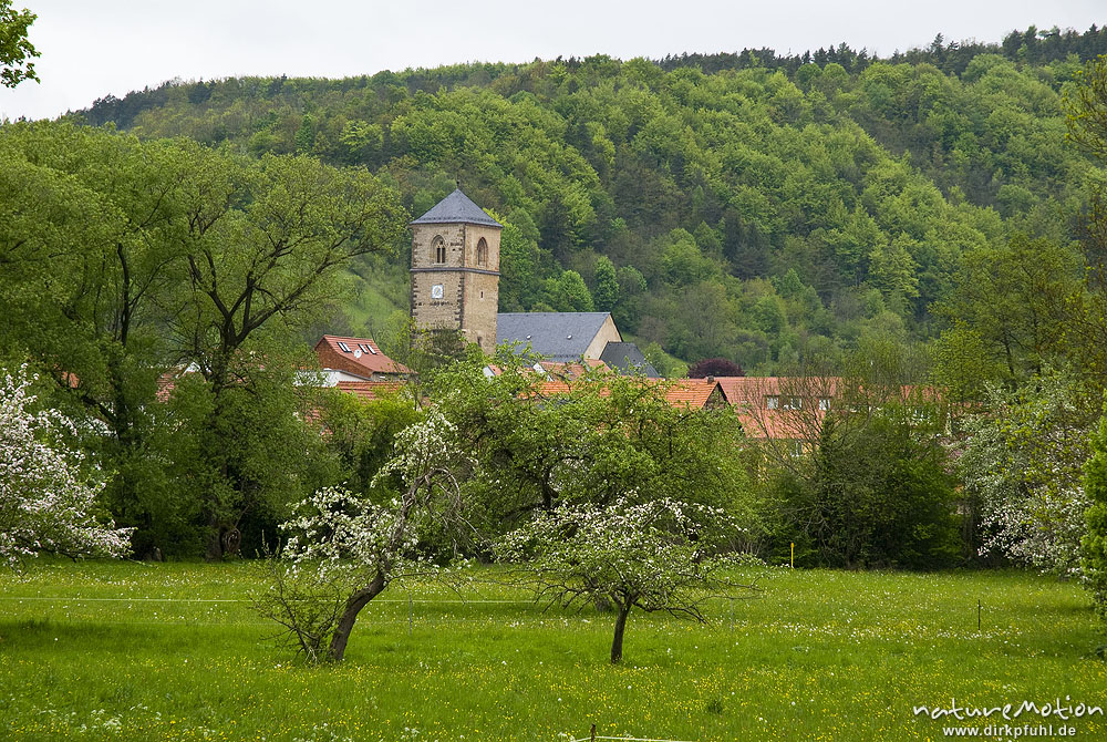 Kirche und blühende Obstbäume, Nicolaikirche, Werratal, Creuzburg, Deutschland
