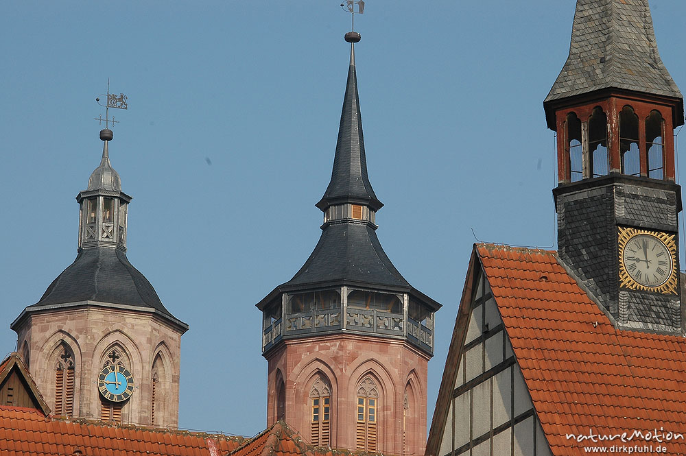 Kirchtumspitzen und Rathausuhr, Johanniskirche, Altes Rathaus, Göttingen Göttingen, Deutschland