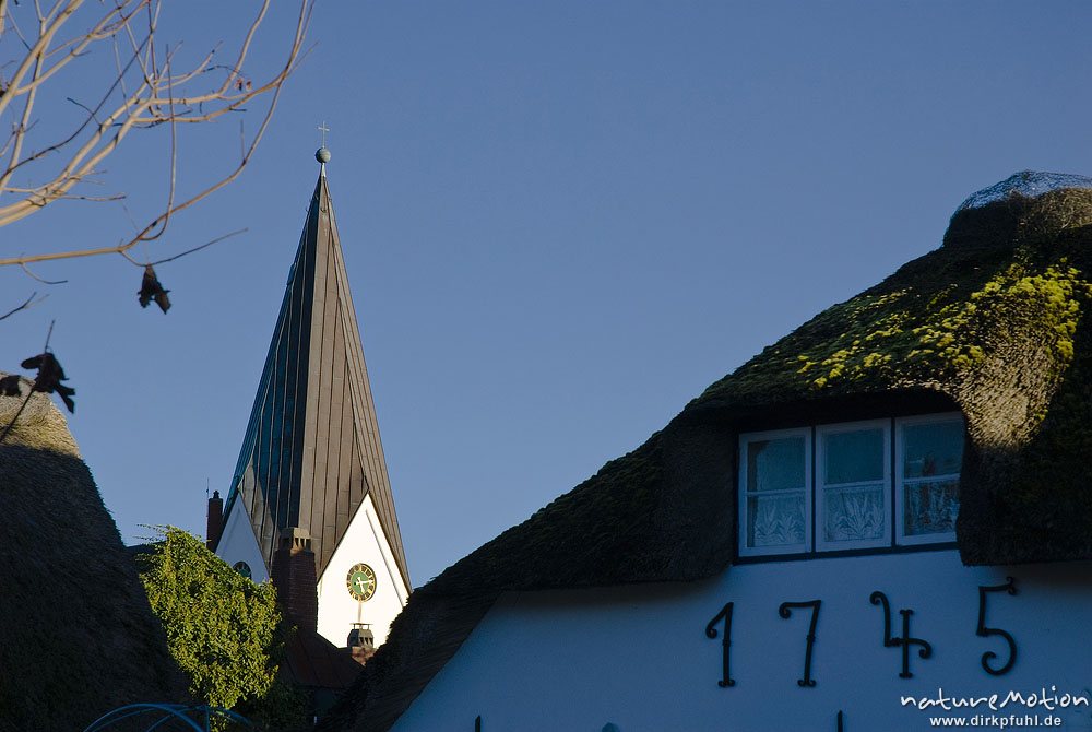 Kirchturm von nebel, Reet gedecktes Dach, Nebl, Amrum, Deutschland