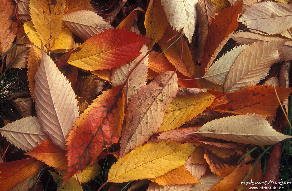 Kirschlaub in roter Herbstfärbung, am Boden liegend, Universität Göttingen, Göttingen, Deutschland