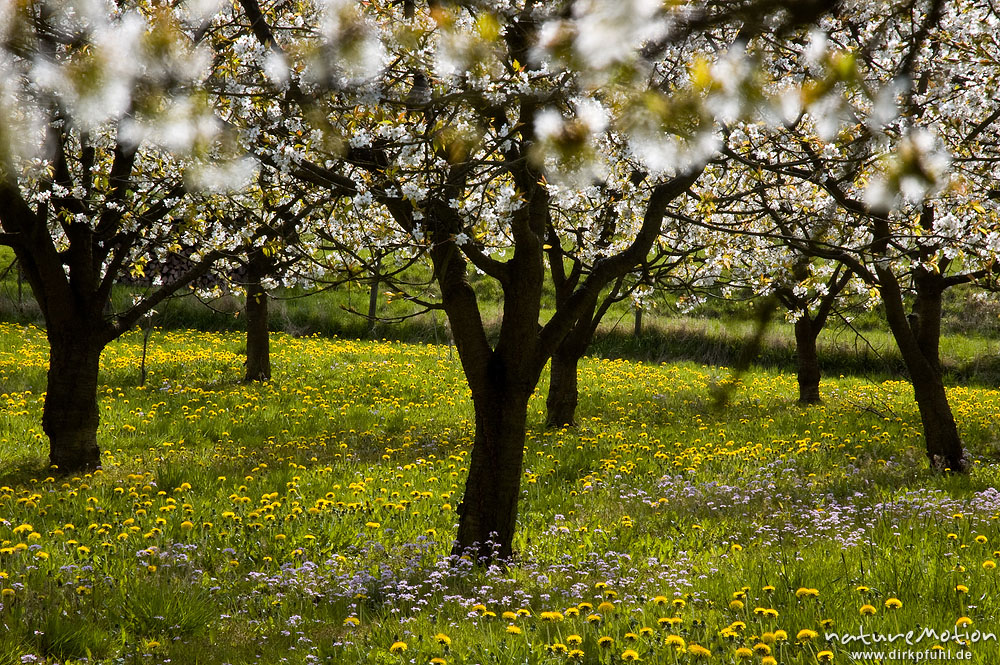 Kischplantage in voller Blüte, darunter blühender Löwenzahn Witzenhausen, Deutschland