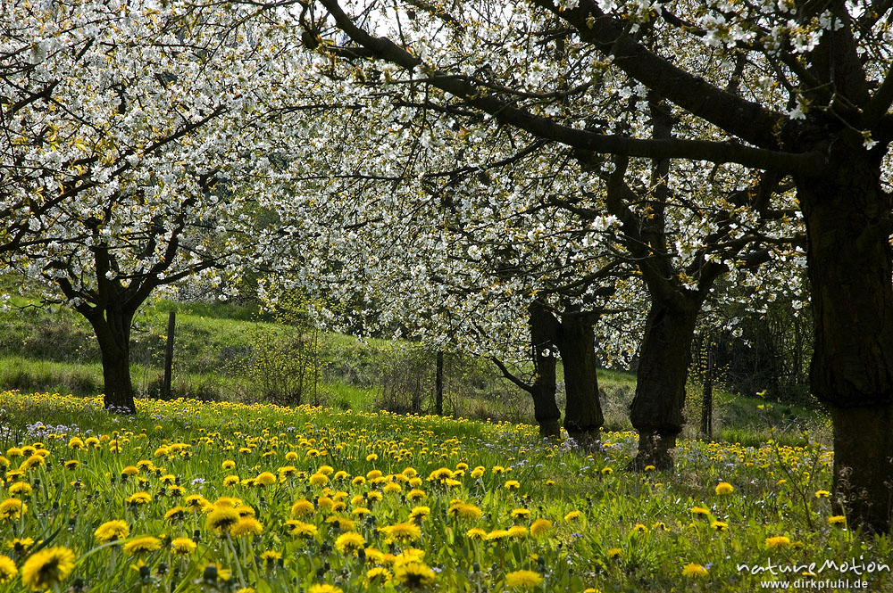 Kischplantage in voller Blüte, darunter blühender Löwenzahn, Witzenhausen, Deutschland