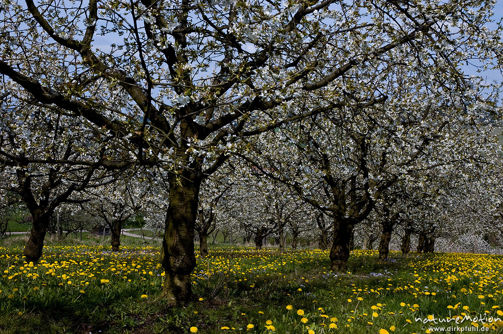 Kischplantage in voller Blüte, darunter blühender Löwenzahn Witzenhausen, Deutschland