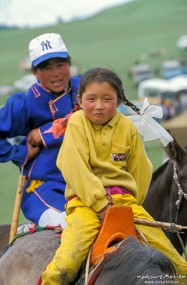 kleines M?dchen mit Z?pfen und Schwester auf Pferd , Mongolei