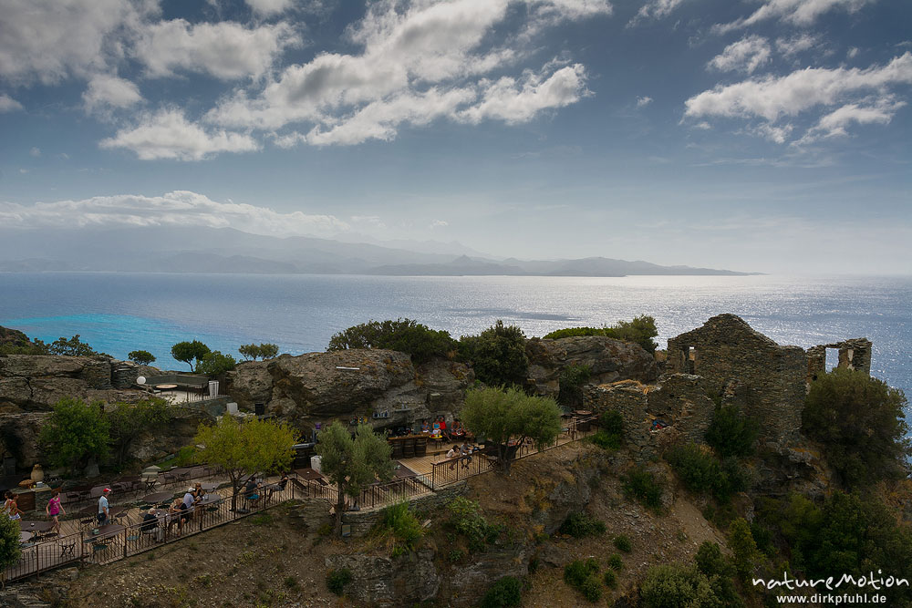 Klippe von Nonza mit Ausflugskcafe, Blick auf die K?ste der Desert Agrigates, Cap Corse, Korsika, Frankreich