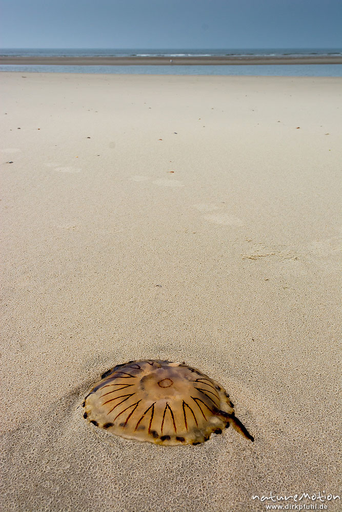 Kompassqualle, Chrysaora hysoscella, Pelagiidae, am Strand angeschwemmtes Tier, Spiekeroog, Deutschland