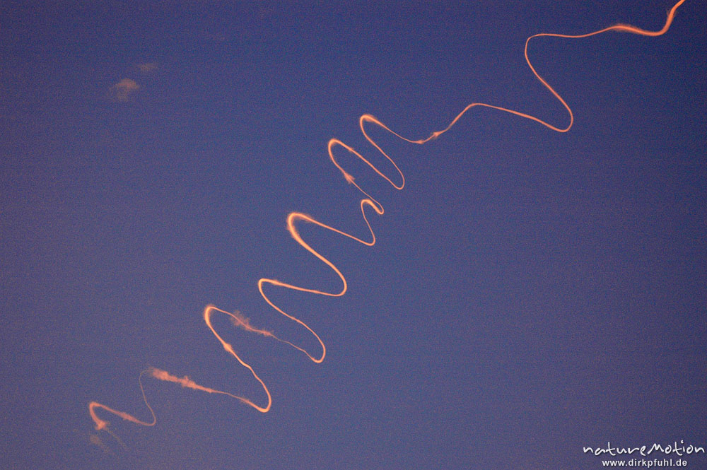 Kondensstreifen von Flugzeug im rötlichen Morgenlicht, vom Wind zu stark gewundener Linie verformt, Göttingen, Deutschland