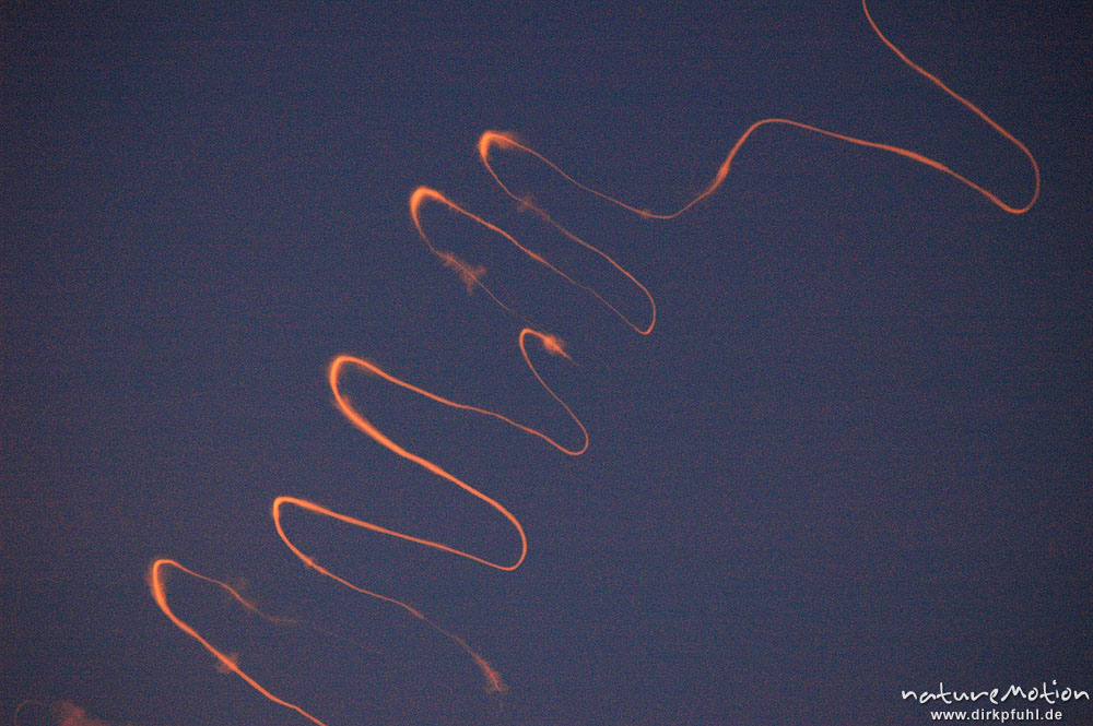 Kondensstreifen von Flugzeug im rötlichen Morgenlicht, vom Wind zu stark gewundener Linie verformt, Göttingen, Deutschland