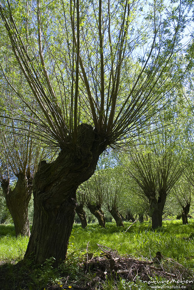 Kopfweiden an Bachlauf, Weichholzaue an der Unstrut, Naturschutzgebiet Unstruttal, Nägelstedt (Unstrut), Deutschland
