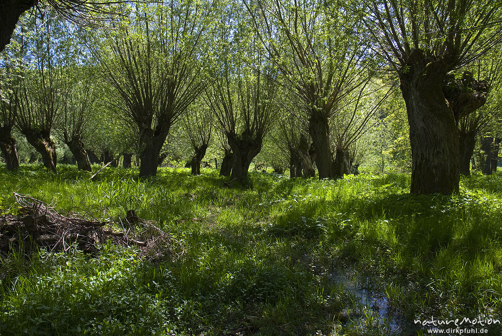 Kopfweiden an Bachlauf, Weichholzaue an der Unstrut, Naturschutzgebiet Unstruttal, Nägelstedt (Unstrut), Deutschland