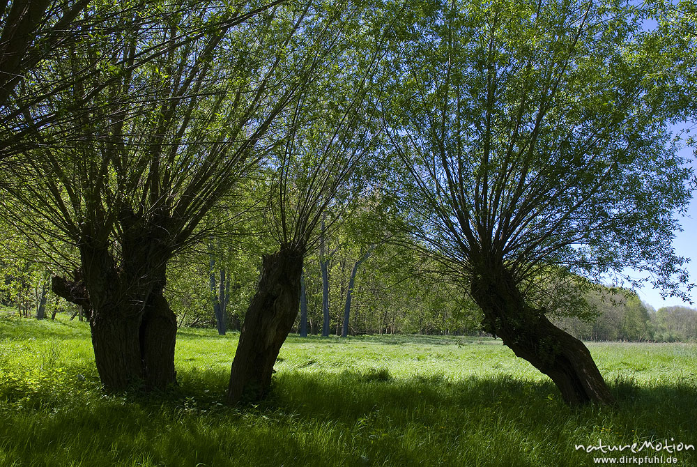 Kopfweiden an Bachlauf, Weichholzaue an der Unstrut, Naturschutzgebiet Unstruttal, Nägelstedt (Unstrut), Deutschland
