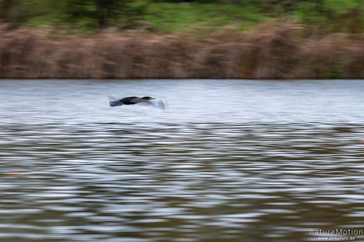 Kormoran, Phalacrocorax carbo, Phalacrocoracidae, Tier fliegt niedrig über den Kiessee, Göttingen, Deutschland