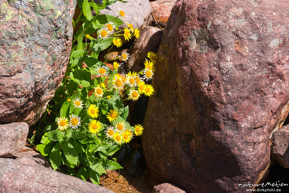 Korsische Gemswurz, Doronicum corsicum, Asteraceae, endemisch, Horst zwischen Felsen am Bachlauf des Golo, oberes Golotal, Korsika, Frankreich