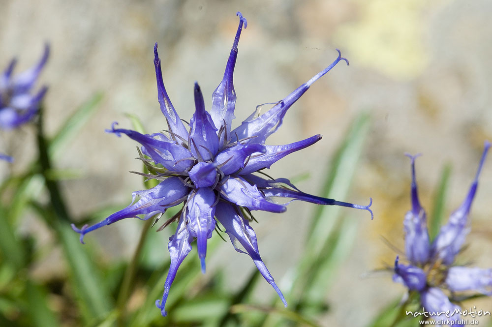 Korsische Teufelskralle, Phyteuma serratum, Campanulaceae, endemisch, Blüte in Aufsicht, Cascade des Anglais, Korsika, Frankreich